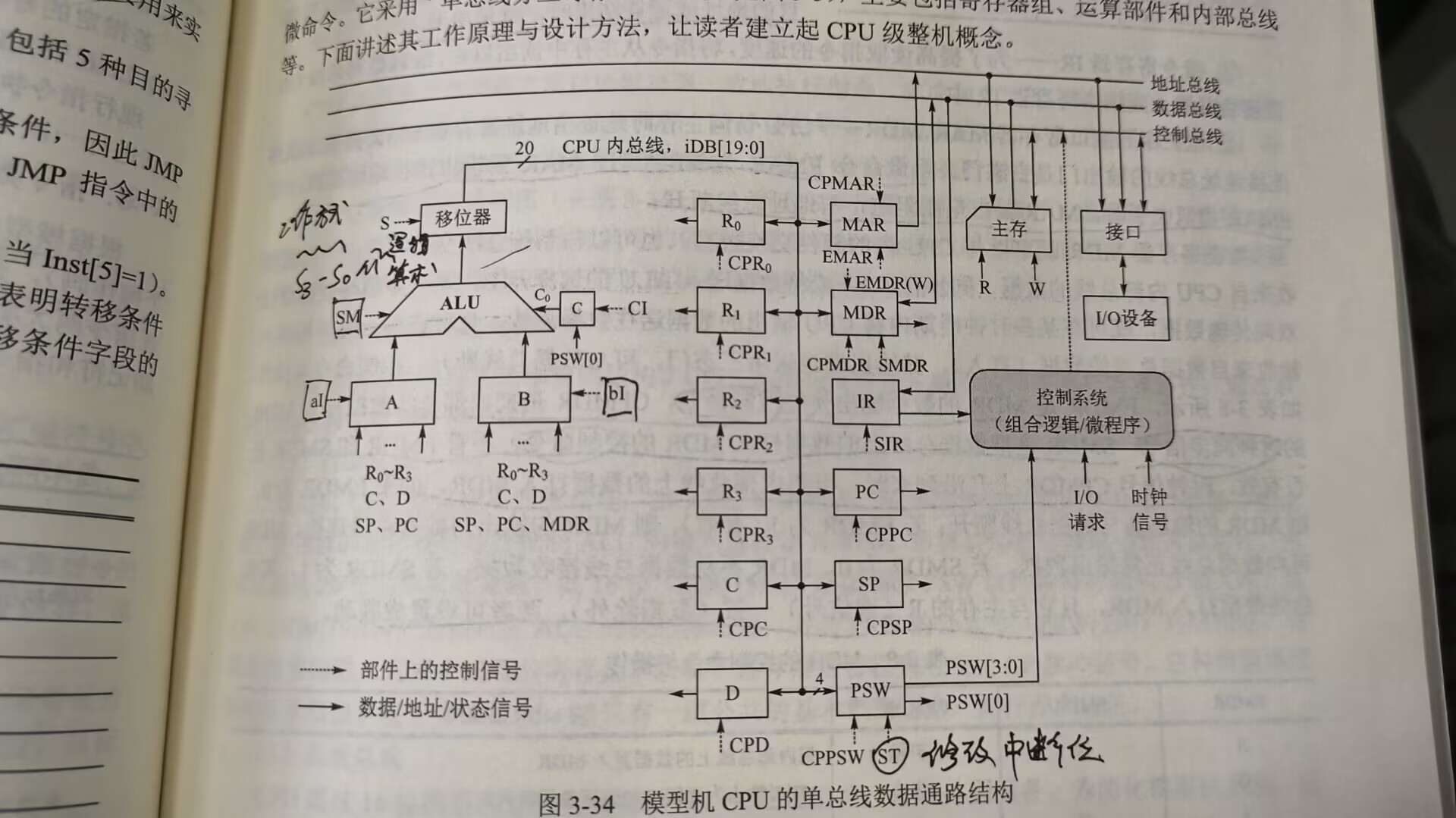 寄存器组:通用寄存器、暂存器、指令寄存器IR、程序计数器PC、程序状态字寄存器PSW、地址寄存器MAR、数据缓冲寄存器MBR(模型的MDR)、栈指针寄存器SP。